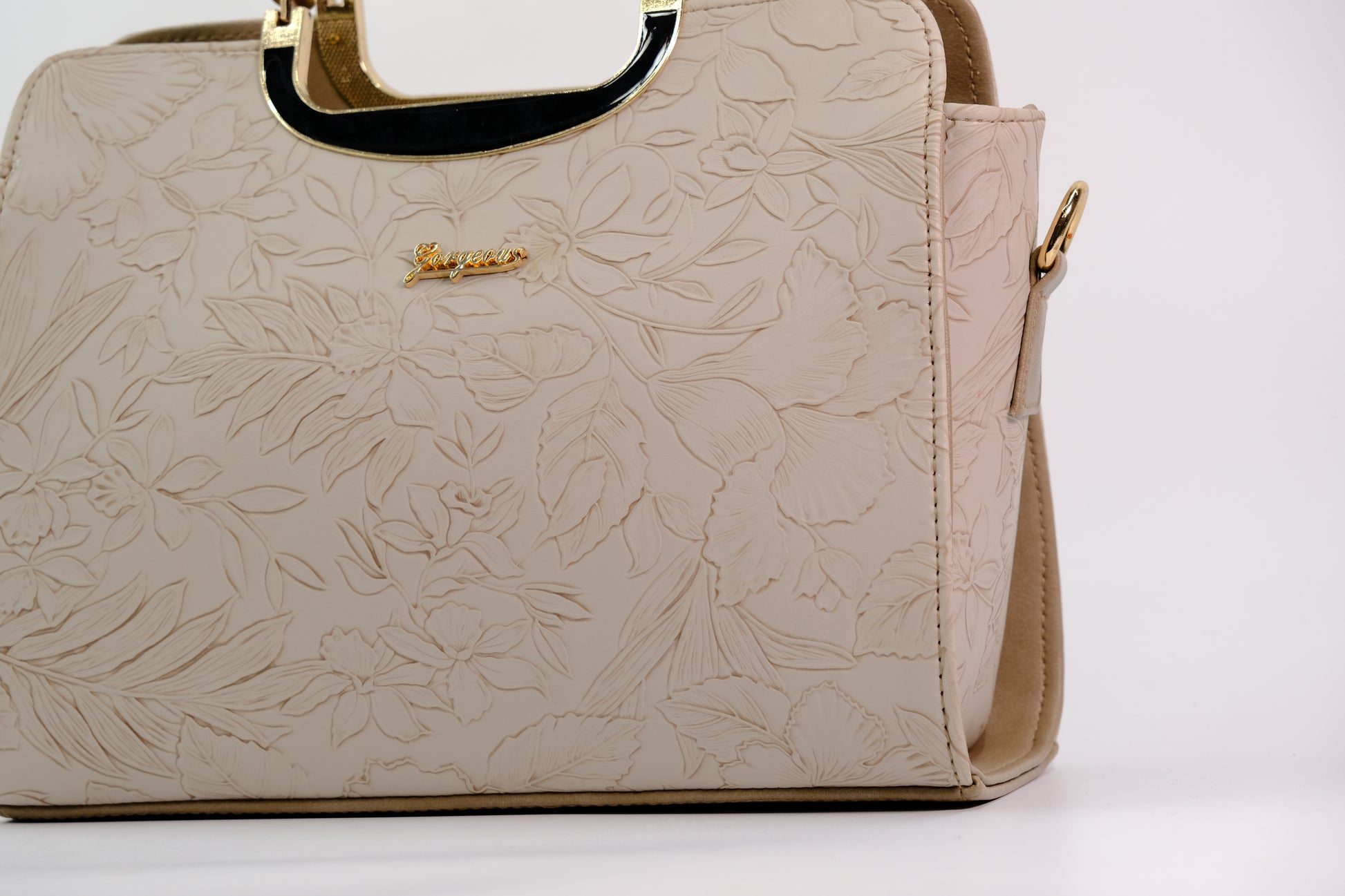 The bag is a light beige or cream-colored handbag with a textured surface, possibly resembling a floral or leaf pattern. It features dual, light brown handles and a black and gold accent piece at the top where the handles attach to the bag. The bag has a structured, rectangular shape with subtle gussets on the sides, suggesting it can expand to hold more items. A small, gold-toned brand name or logo is visible on the front center of the bag. The overall style of the bag suggests a classic and versatile design, suitable for various occasions.